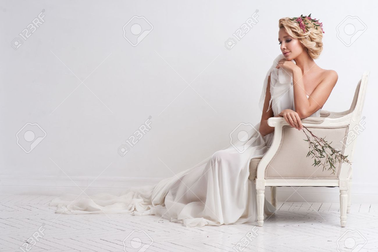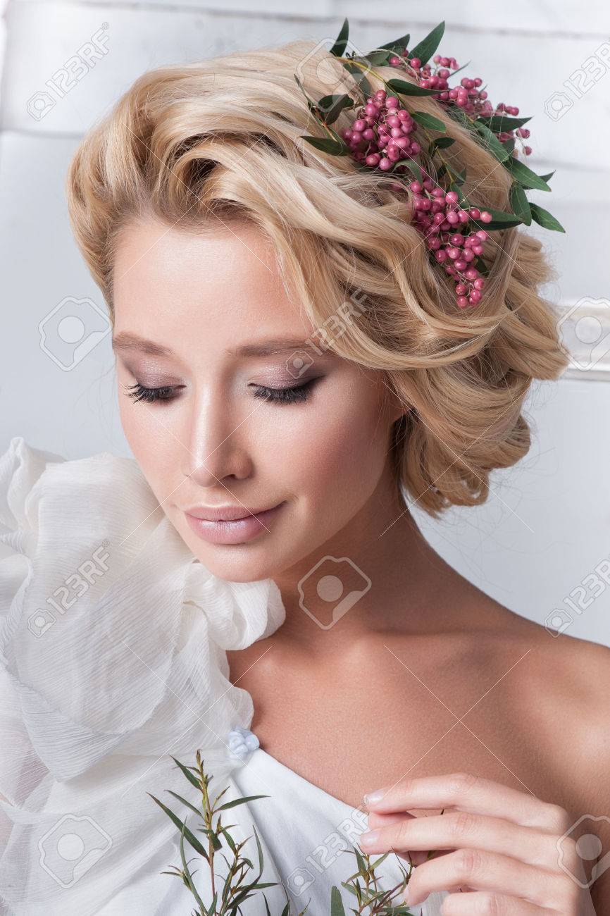 braut junges mode modell mit bilden gelocktes haar blumen im haar brautmode schmucksachen und schonheit frau im weissen kleid stockbild bild von weissen haar 85793595