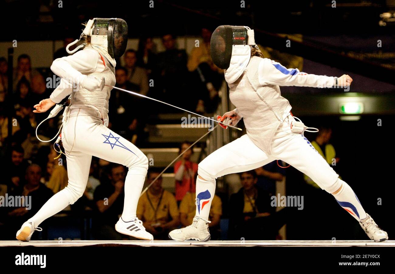 https www alamyimages fr delila hatouel l d israel concurrence corrine maitrejean de france a la demi finale de la competition d escrime de la coupe du monde a gdansk le 1er mars 2008 reuters peter andrews pologne image400734122 html