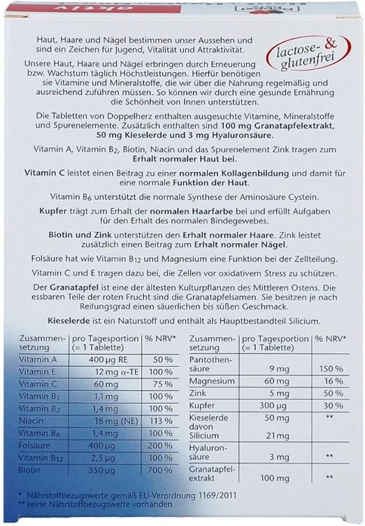 Haut haare und nägel gehören wohl zu den prägnantesten und meist gepflegtesten schönheitsmerkmalen von uns frauen. Doppelherz haut haare nägel enthält neben 100 mg granatapfelextrakt 50 mg kieselerde und 3 mg hyaluronsäure ausgewählte mikronährstoffe die zahlreiche funktionen im körper erfüllen. Vitamin a vitamin b2 biotin niacin und das spurenelement zink tragen zum erhalt normaler haut bei.
