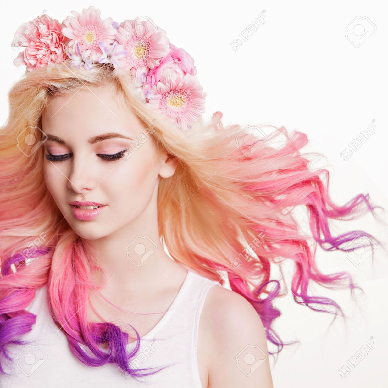 jugend frauen mit lockigem farbigen haar und blumen weiss und rosa hintergrund schonheit fliegende haare