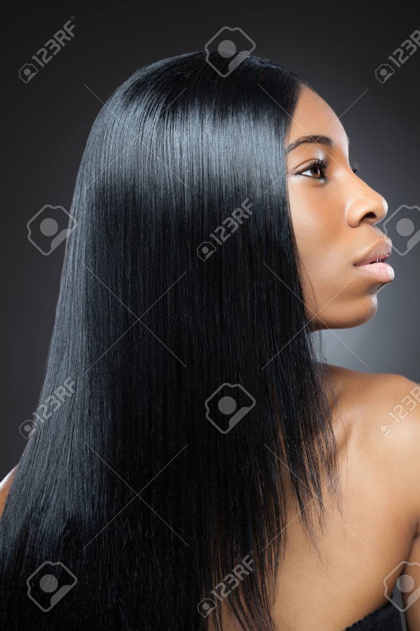 schone junge schwarze frau mit langen glatten haaren
