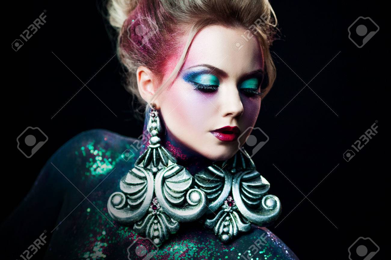 https www istockphoto com de foto attraktive frau mit goldenen glitzer auf gesicht und kurze haare die auf der suche gm995312580 269413141