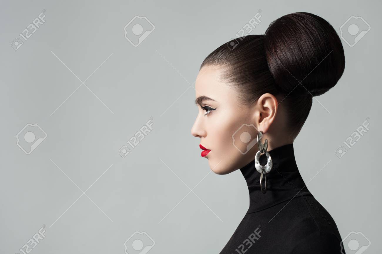 mode portrat der eleganten jungen frau mit haar brotchen frisur und eyeliner bilden nettes weibliches modell das schwarzes rollkragen jersey profil portrat tragt lizenzfreie fotos bilder und stock fotografie image 96921639