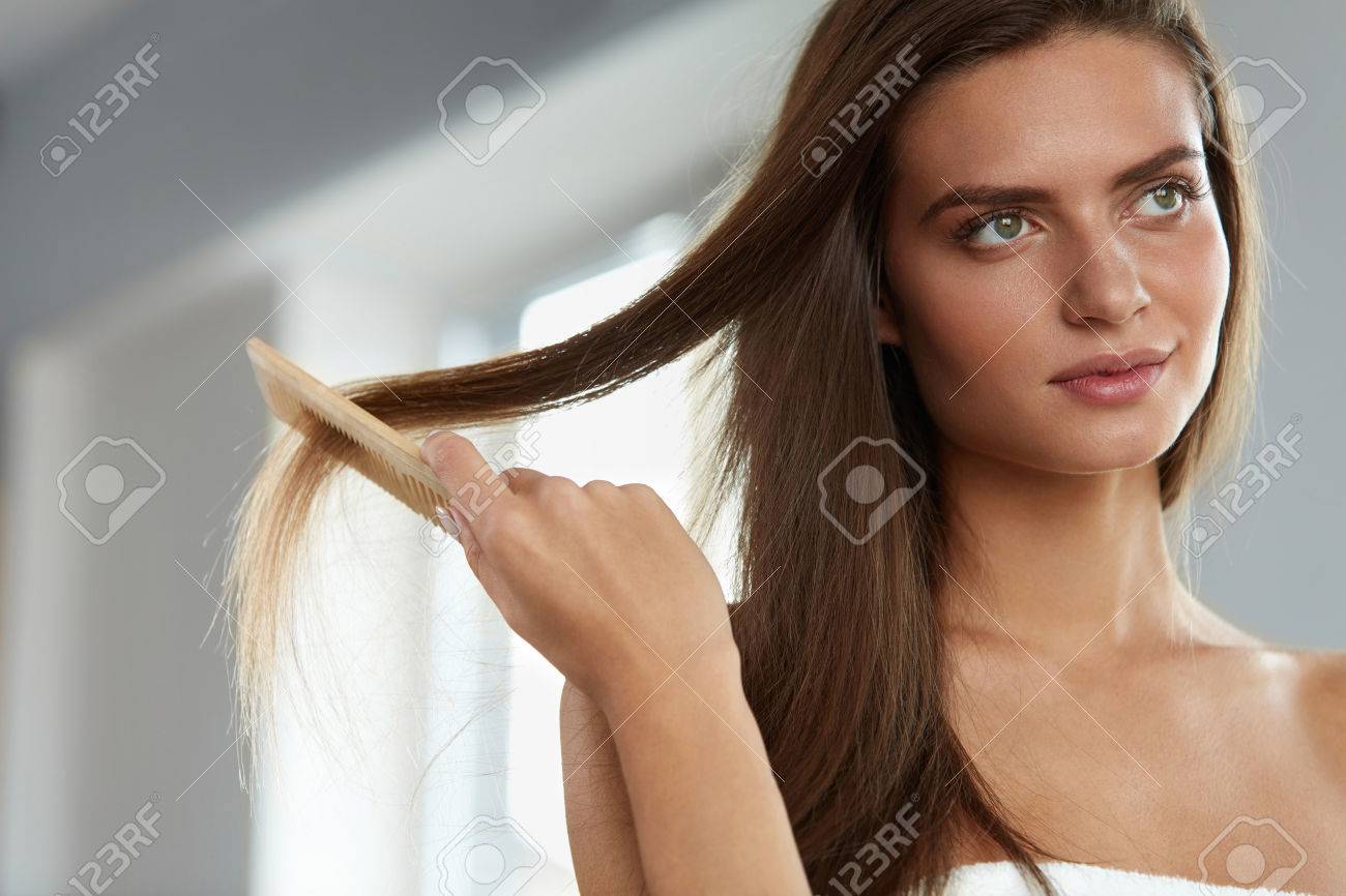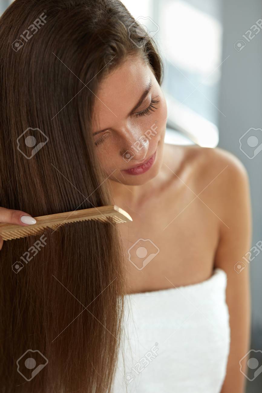haar gesundheit und schonheit nahaufnahme der jungen frau mit schonen gesunden langen haar hairbrushing nach dem bad portrait of sexy madchen im tuch streichen mit kamm burste gesunder lebensstil hohe auflosung lizenzfreie