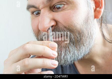 close up portrat eines mannes zu entfernen nase haare mit einer pinzette auf dem grauen hintergrund lizenzfreie fotos bilder und stock fotografie image 59940442
