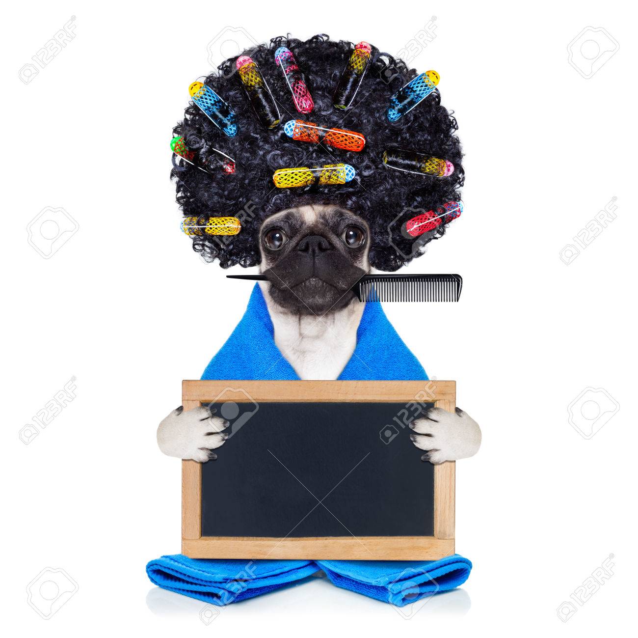 mops hund mit haar lineale afro lockiges perucke haare beim friseur mit blauen handtuch isoliert auf weissem hintergrund