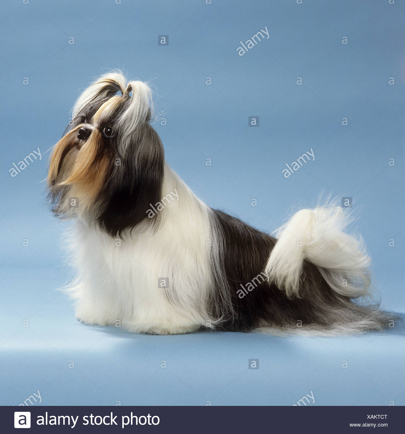 shih tzu hund mit langen haaren profilansicht auf hellen weissen und blauen hintergrund