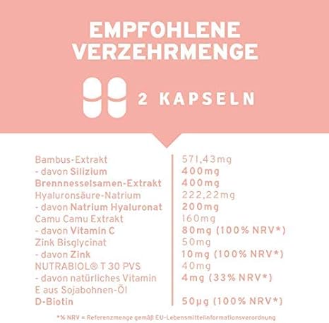 Das innonature haut haare nägel enthält hochdosiertes zink und biotin aus den rein natürlichen inhaltsstoffen bambus brennnessel hyaluron vitamin e und camu camu.