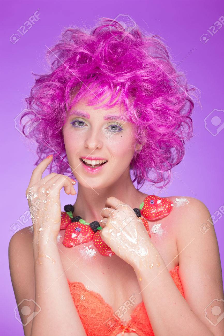 sexy madchen mit rosa haaren eine kette von sussigkeiten lizenzfreie fotos bilder und stock fotografie image 66688390