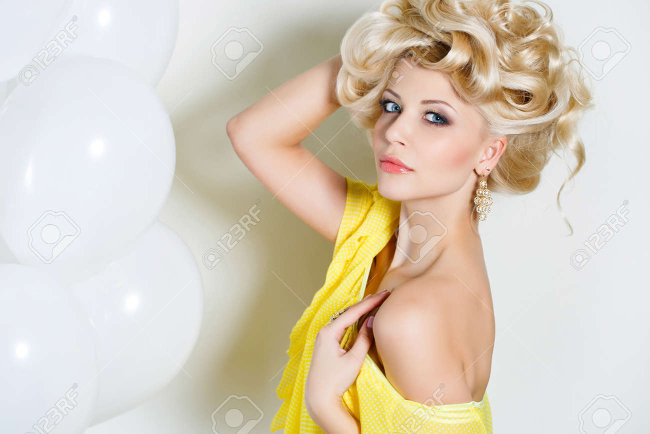 junge schone frau blond mit schicken langen lockigen haar blaue augen schone make up und nagellack tragt einen ring an den finger und ohren