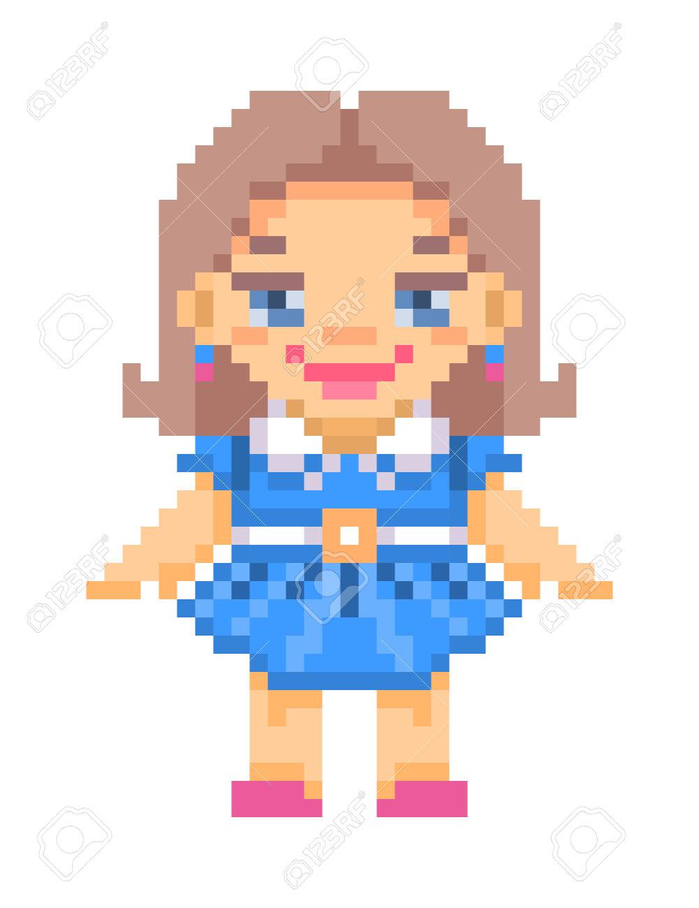 abbildung kunst pixel stand lachelnd puppe mit langen braunen haaren tragen blaue kleid mit weissem kragen