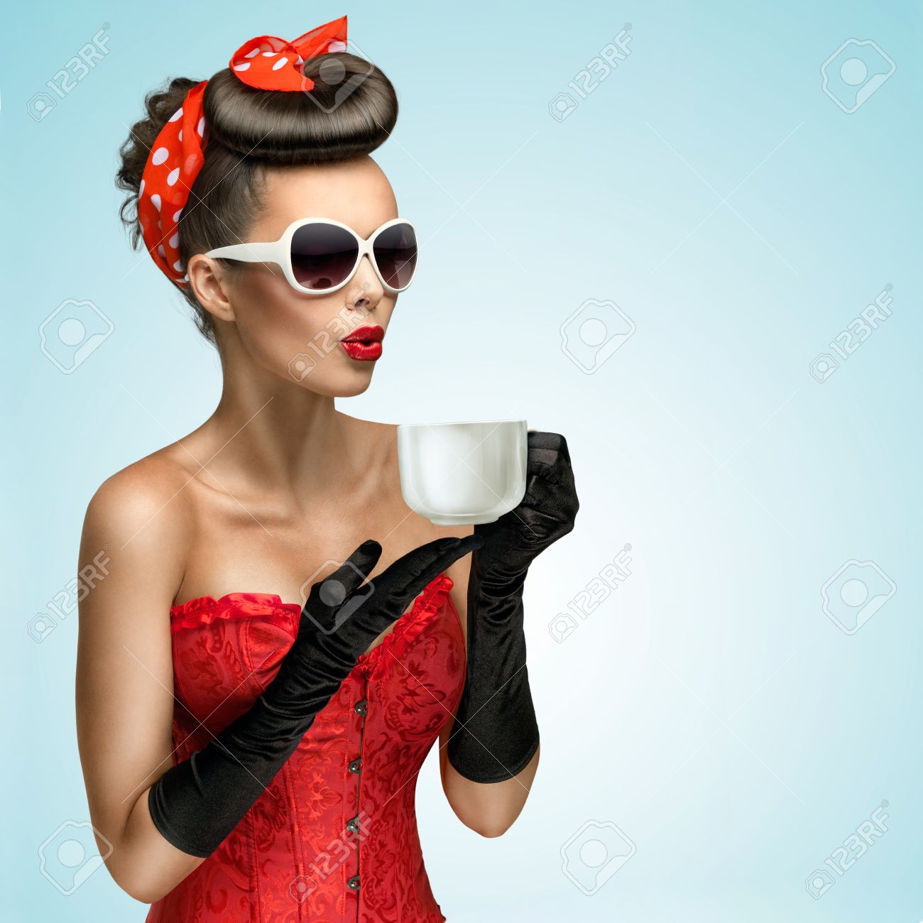 dreiviertel portrat von glamourous pinup madchen tragen vintage handschuhe und rote schleife im haar halten eine tasse heissen kaffee oder tee und abkuhlen lizenzfreie fotos bilder und stock fotografie image 41248110