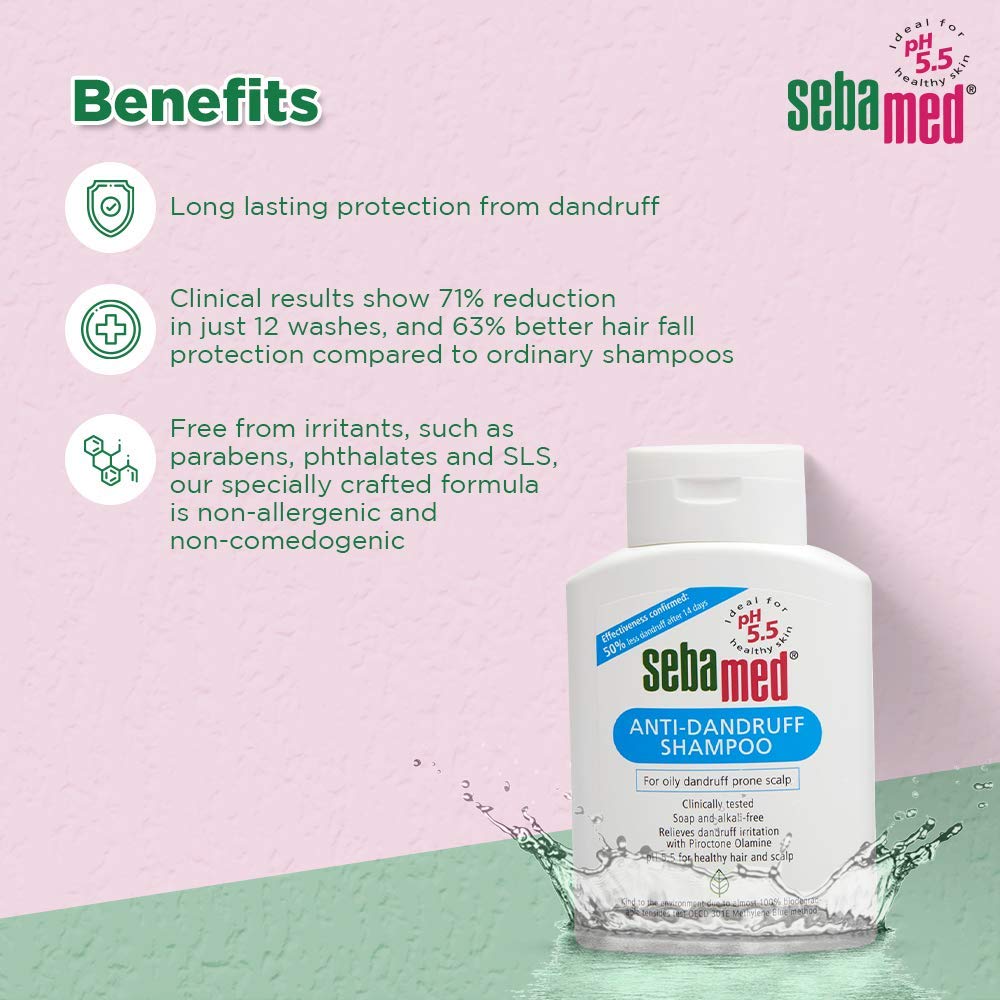 Sebamed die medizinische hautpflege mit dem ph wert 5 5 wenn ihre haut empfindlich oder problematisch ist. Das sebamed antischuppen shampoo beseitigt mit dem wirkstoff piroctone olamine nachweislich schuppen. Das shampoo sebamed hair care reinigt effektiv die kopfhaut wäscht gründlich die haare und gibt ihnen ihre natürliche schönheit zurück. Die speziell entwickelte tensidkombination hilft reizung und austrocknung von kopfhaut und haar zu vermindern.