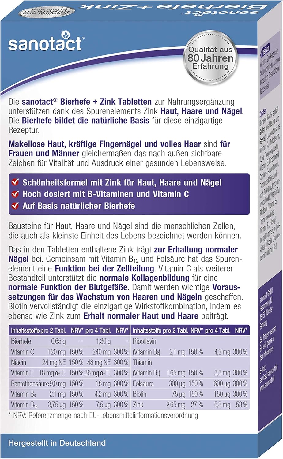 sanotact bierhefe zink tabletten 60 stk mit zink fur schones haar gesunde haut und kraftige nagel vegan